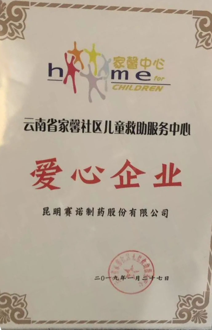 昆明賽諾制藥股份有限公司被“家馨”授予愛(ài)心企業(yè)稱(chēng)號